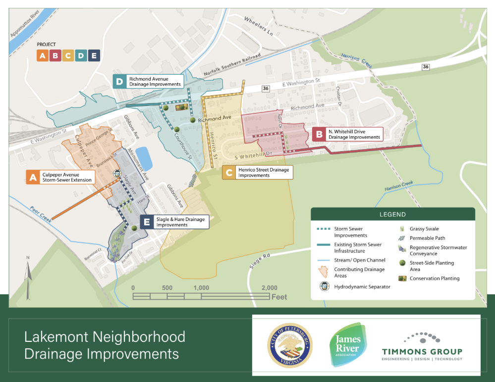 Some residents of Petersburg’s Lakemont and Whitehill neighborhoods have experienced localized flooding as a result of an inadequate storm sewer system in recent years. Poor drainage in areas of the community is exacerbated by the increasing frequency of heavy rain events fueled by climate change. The Petersburg Walkable Watershed Concept Plan (2016) and Lakemont Neighborhood Drainage Study (2019) identify projects capable of alleviating flooding in the community. The City of Petersburg’s Stormwater Management Program is actively working to design and implement drainage improvement projects with support from the James River Association and Timmons Group. Information about projects and a map providing an overview of the Lakemont Neighborhood drainage improvements is provided below.