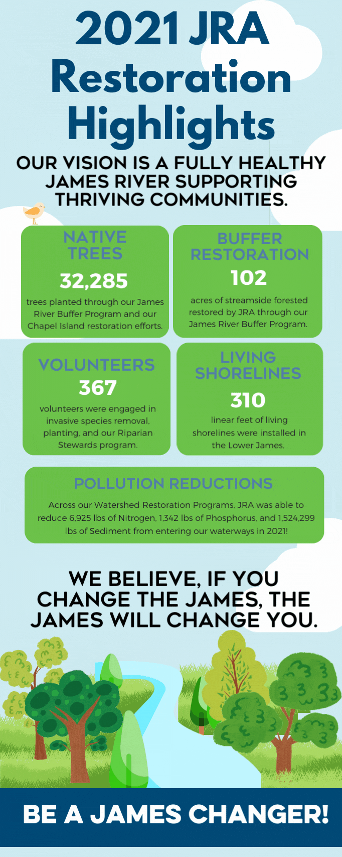 Our Watershed Restoration team takes a regional approach to the local issues facing our 10,000 square mile watershed. From riparian buffers in the Middle and Upper James, living shorelines in the Lower James, to green infrastructure solutions in our urban and suburban areas. We partner with localities, other organizations, and landowners to improve the health of the James River and help citizens realize the benefits of a healthy James River.