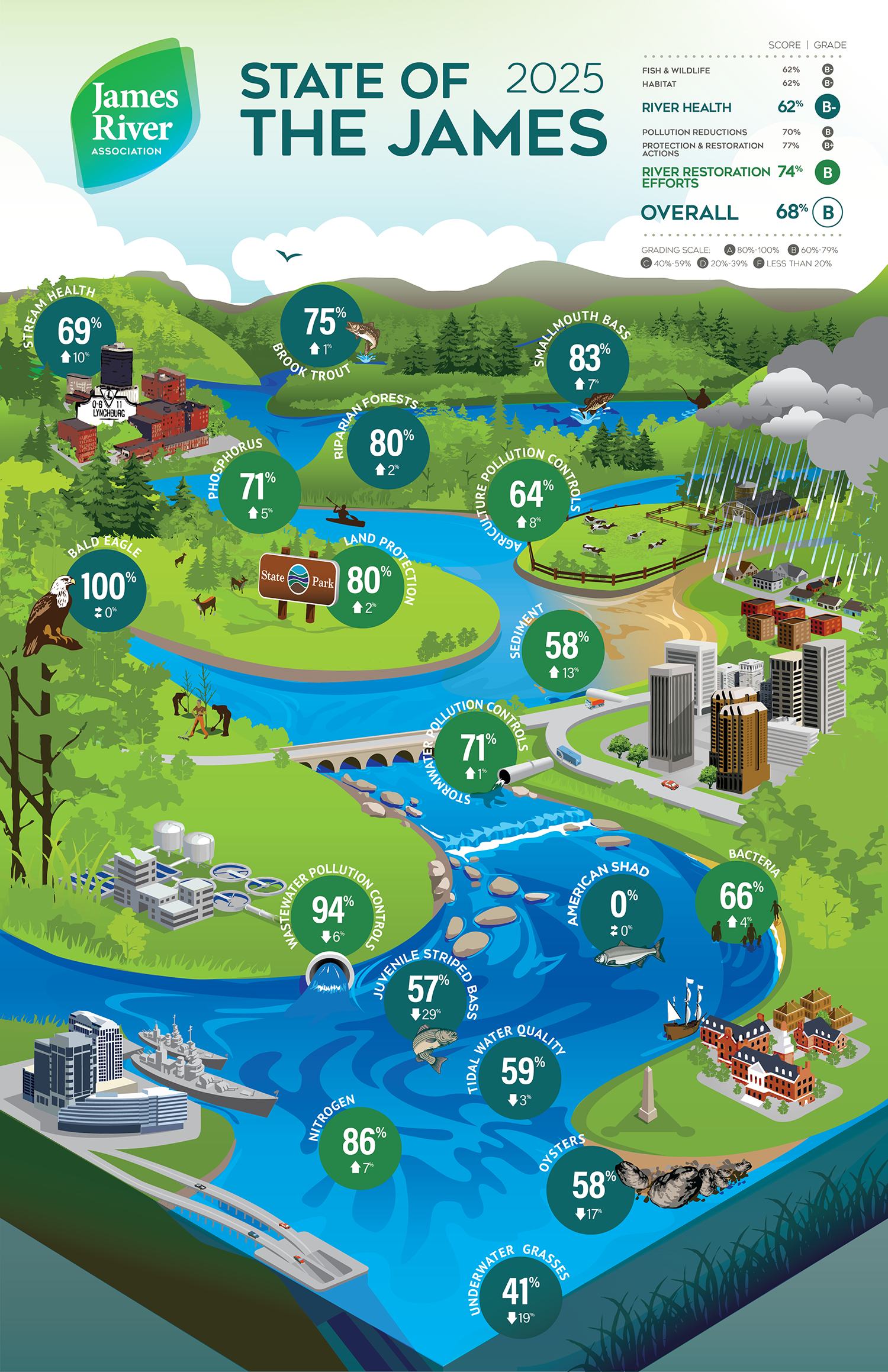 • Big comeback over 50 years: In 1975, the James River was shut down to any kind of fishing due to toxic contamination. Untreated raw sewage and industrial waste also made the river very unhealthy. Since then, things have gotten much better. The State of the James now gets an overall grade of B with a score of 68%.